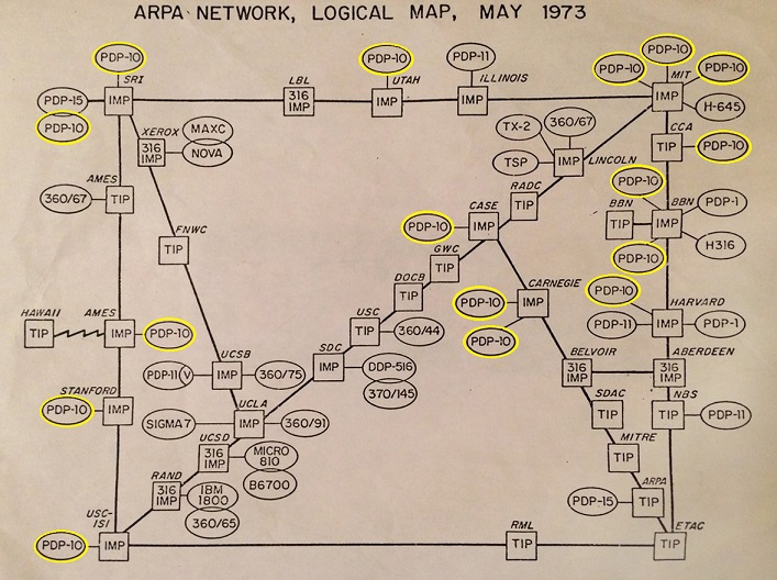 My first tech job was as a mainframe computer operator. Lucky for me, the computers were DEC PDP-10s. These timesharing systems supported remote access for customers throughout the United States and the UK. But more importantly (at least for me) was that DEC-10s were also used in the best computer science research labs, e.g., BBN, CMU, MIT, Stanford, etc... ARPANET, the computer network that eventually became the Internet was full of DEC PDP-10 systems. Checkout an early map of it:
