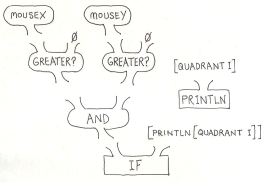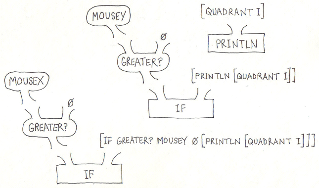 It has been a few lessons since plumbing diagrams were introduced. Here we actually have three plumbing diagrams. The way to read this illustration is to start in the lower-left corner. Here we have the outermost IF instruction. Its input is a predicate - true is output if the mouse's X coordinate is greater than zero, otherwise false is output. The second input is a list that represents instructions that will be performed if (and only if) the first input outputs true.